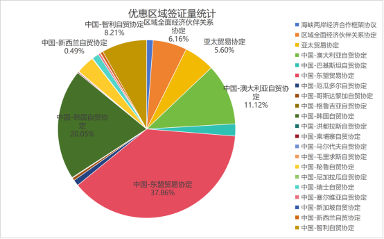 湖北省贸促会签发优惠原产地证涉及21类区域优惠自贸协定,比24年新增2类区域优惠自贸协定,分别是中国-洪都拉斯自贸协定、中国-马尔代夫自贸协定。签证量位居前五位的区域优惠原产地证是中国—东盟、中国—韩国、中国—澳大利亚、中国-智利和RCEP,这5个优惠区域累计签证量占总签证量的83.4%,各优惠区域签证量占比见下图: