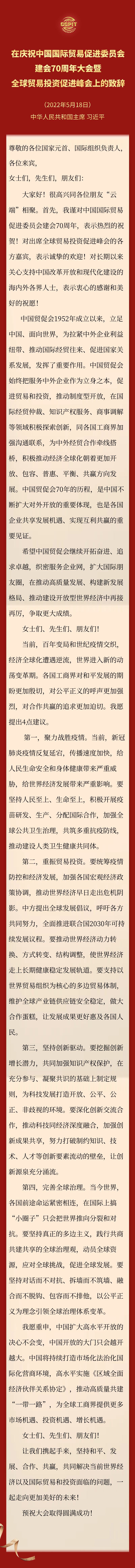 重温习近平主席在庆祝中国国际贸易促进委员会建会70周年大会暨全球贸易投资促进峰会上的重要视频致辞